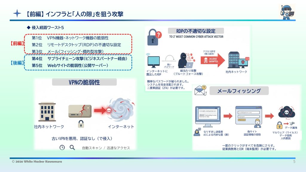 本講座では、サイバー攻撃者が具体的に「どこを入り口として」企業に侵入してくるのか、最新の統計に基づいた「侵入経路ワースト5」を徹底解説します。より深く理解していただくために【前編】【後編】の2本立てでお届けします。