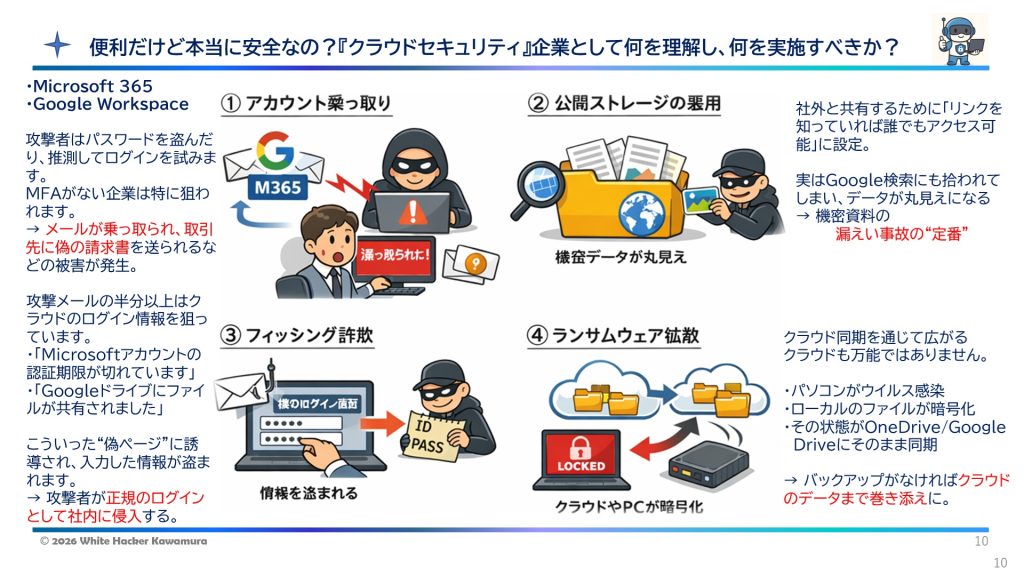 MFAの必須化、権限の最小化、ストレージ共有設定の見直し、ログ監視、端末管理、そしてゼロトラストの基礎など、どれも“すぐ実践できて効果が大きい”内容です。また、クラウドの監視・防御サービスについても、中小企業に必要な最低限のポイントに絞って解説します。